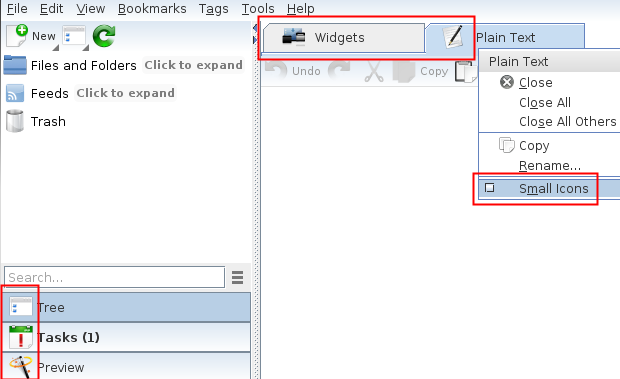 * NEW: Option to show Today and Tomorrow tasks in alarm notifications (see menu bar|Tools|Settings|Tasks) Notepad Preview panel: * NEW: Makagiga can now open linked documents in tabs instead of in an external application. You can combine this feature with Markup Preview/Wiki Tools plugin to create a basic wiki-like system. Tree: * NEW: Added function to remove existing document password protection (see Properties|Set Password...|Remove Password button) User Interface: * NEW: Option to set larger Sidebar or Tabs icons